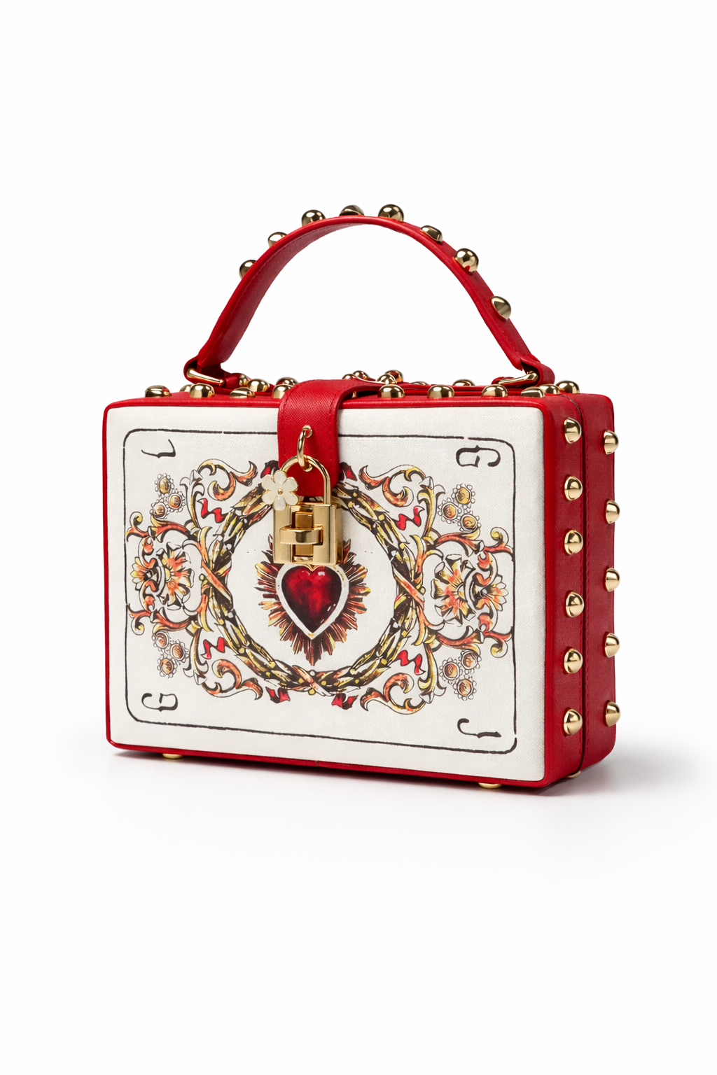 Crafted with a structured silhouette, this bag is detailed with gold-tone studs, a top handle, and a decorative heart lock closure that adds a luxurious, romantic touch. The red trim and handle create a striking contrast against the ivory background, making it the perfect accessory for both day and night looks.