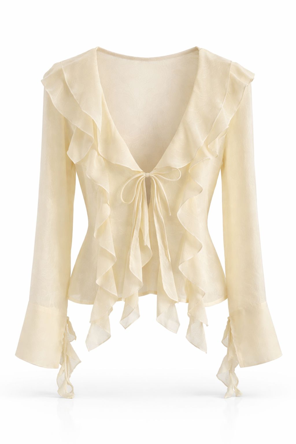 The open-front design closes with a front tie, allowing you to adjust the fit and neckline effortlessly. Long sleeves with soft ruffle accents add movement and charm, making Ariana the perfect piece to elevate both casual and dressed-up looks.