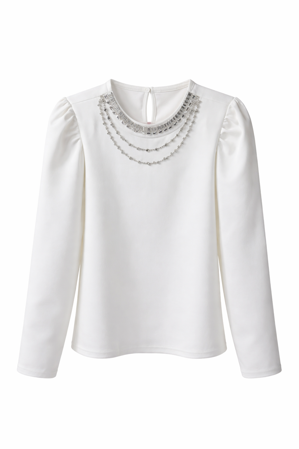 The Isabella Embellished White Top brings a touch of soft glamour to your everyday style. Designed in a smooth, comfortable fabric, it features elegant puffed shoulders and a beautifully detailed neckline adorned with shimmering crystal-inspired embellishments. Its clean silhouette makes it perfect for dressing up denim, skirts, or tailored pants, adding a refined sparkle without being over the top.