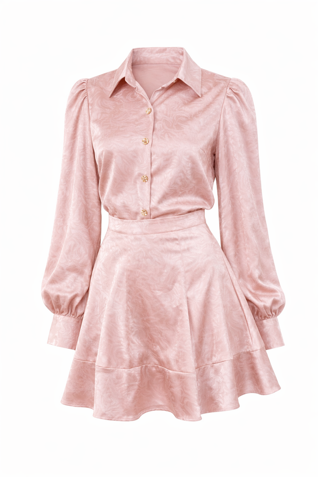 The button-up blouse features a classic collar and softly gathered sleeves that add a romantic touch, while the high-waisted skirt flatters the waist and flows gently with every step. The satin finish gives it that elevated, luxurious feel that works perfectly for brunch dates, special occasions, or when you simply want to look polished without trying too hard.