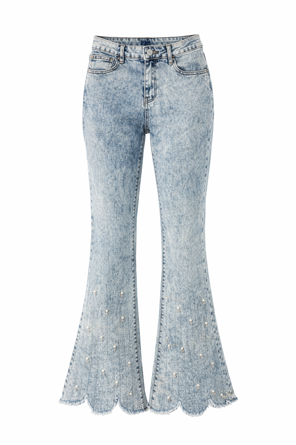 Rock the retro look with these Amelia Flared Denim Jeans! Mid-rise waist ensures a flattering fit, while the rhinestones and pearls add some sparkle to your outfit. Perfect for a fun and playful vibe, these jeans will make you stand out in a crowd.