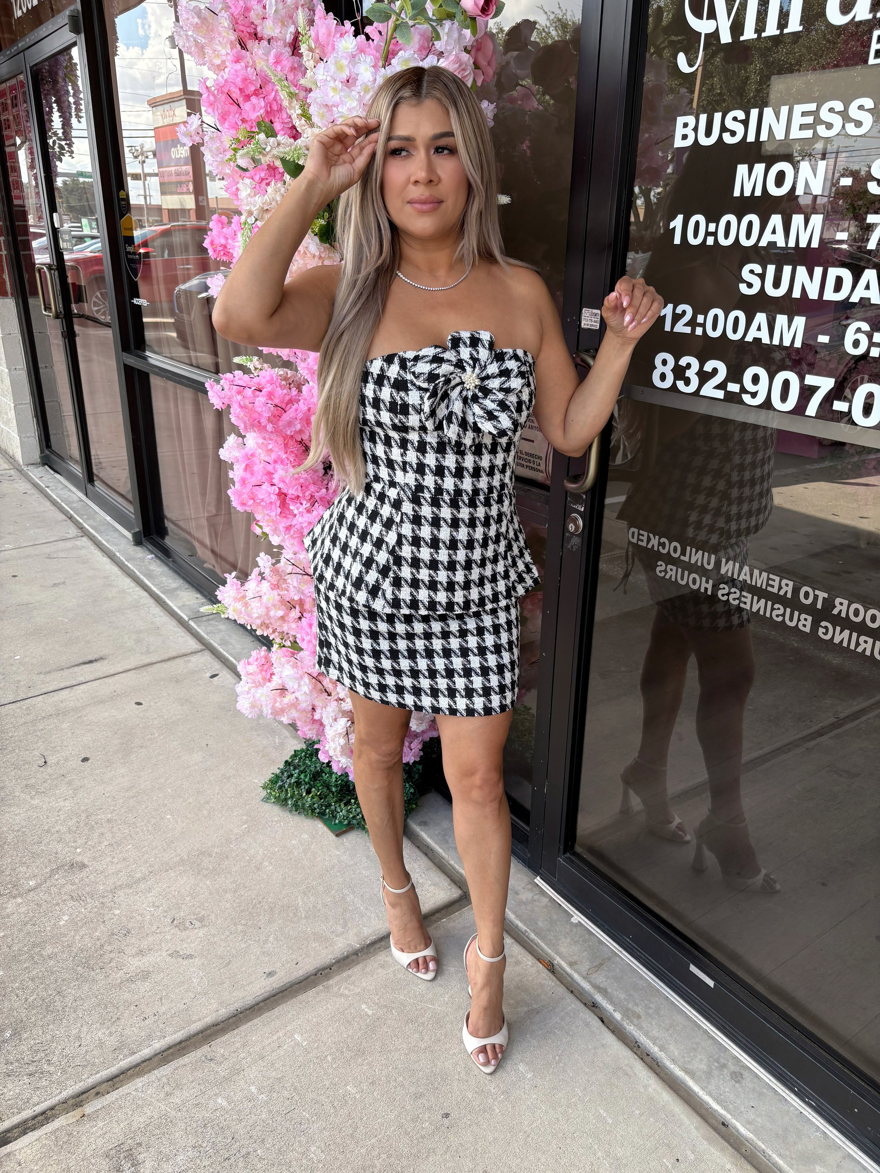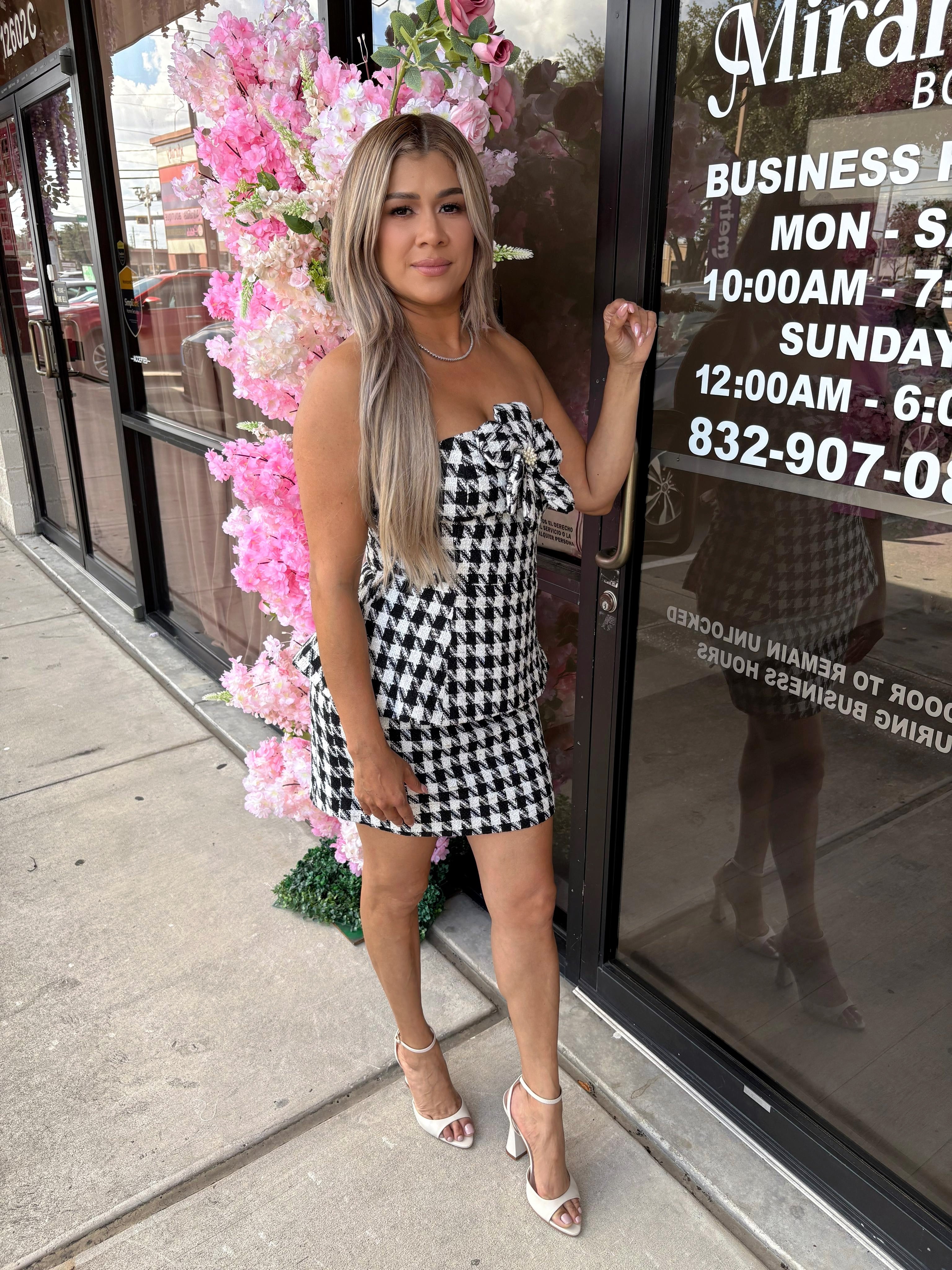 This Coco Matching Set features an elegant strapless top and skirt, crafted from a timeless tweed fabric. With delicate flower detailing on the front, this set is the perfect combination of sophistication and feminine charm. Elevate your wardrobe with this must-have matching set.