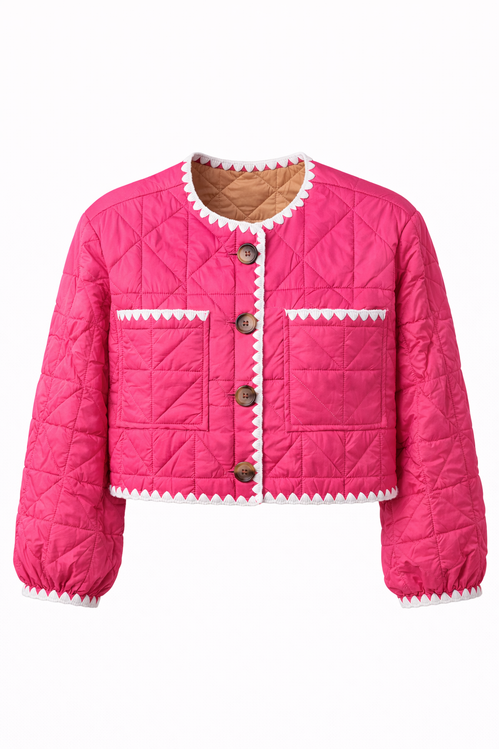 Designed to be reversible, JANA offers two looks in one: a vibrant fuchsia exterior and a warm camel-brown interior, finished with delicate white scalloped trim and classic wooden buttons that remain consistent on both sides. Lightweight yet cozy, it’s perfect for transitional weather and everyday styling.