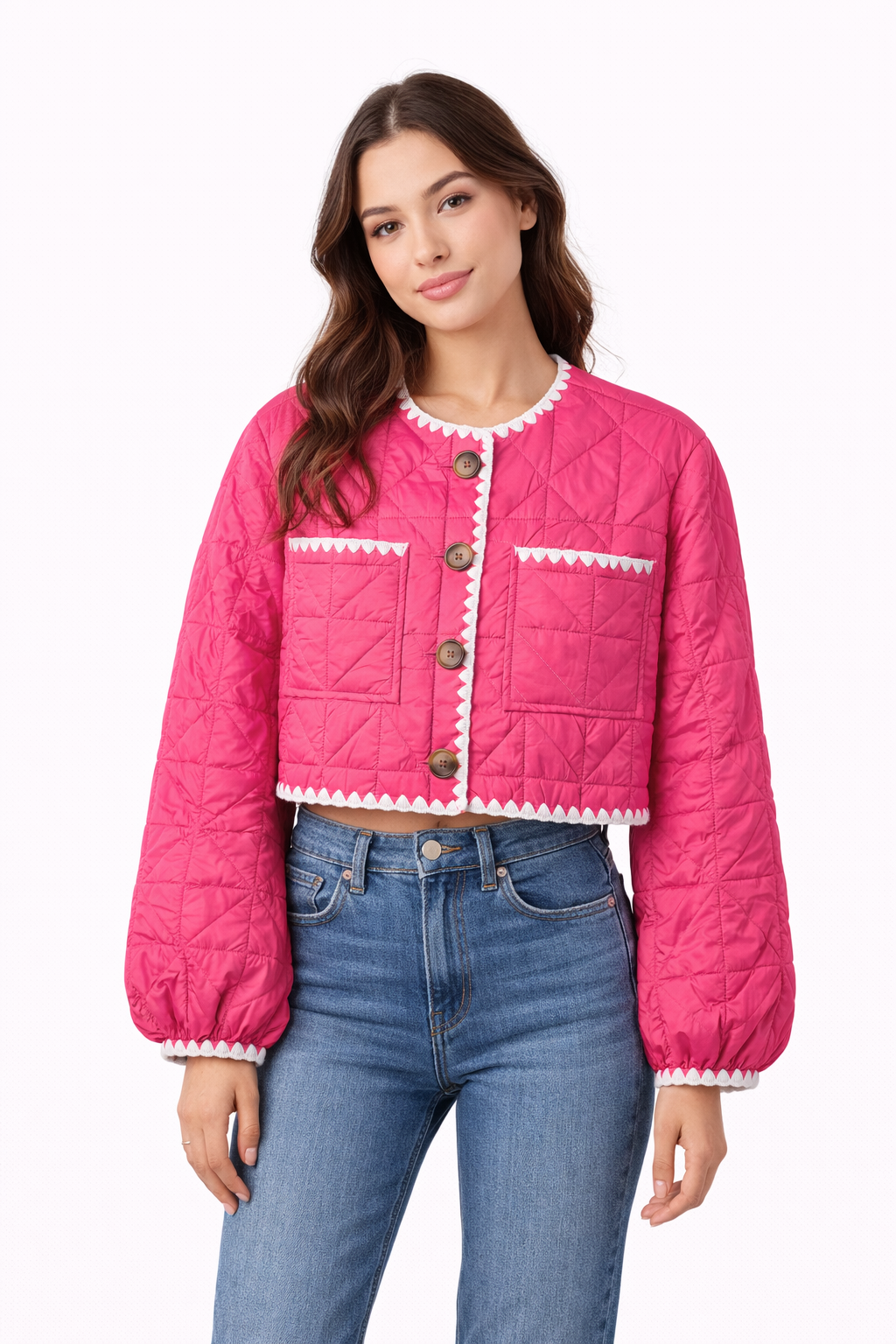 The JANA Cropped Jacket is a statement layering piece designed to elevate any outfit with playful, feminine charm. Featuring a cropped silhouette and soft quilted texture, this jacket stands out with its puffy sleeves that taper gently at the cuffs, creating a flattering and cozy shape.