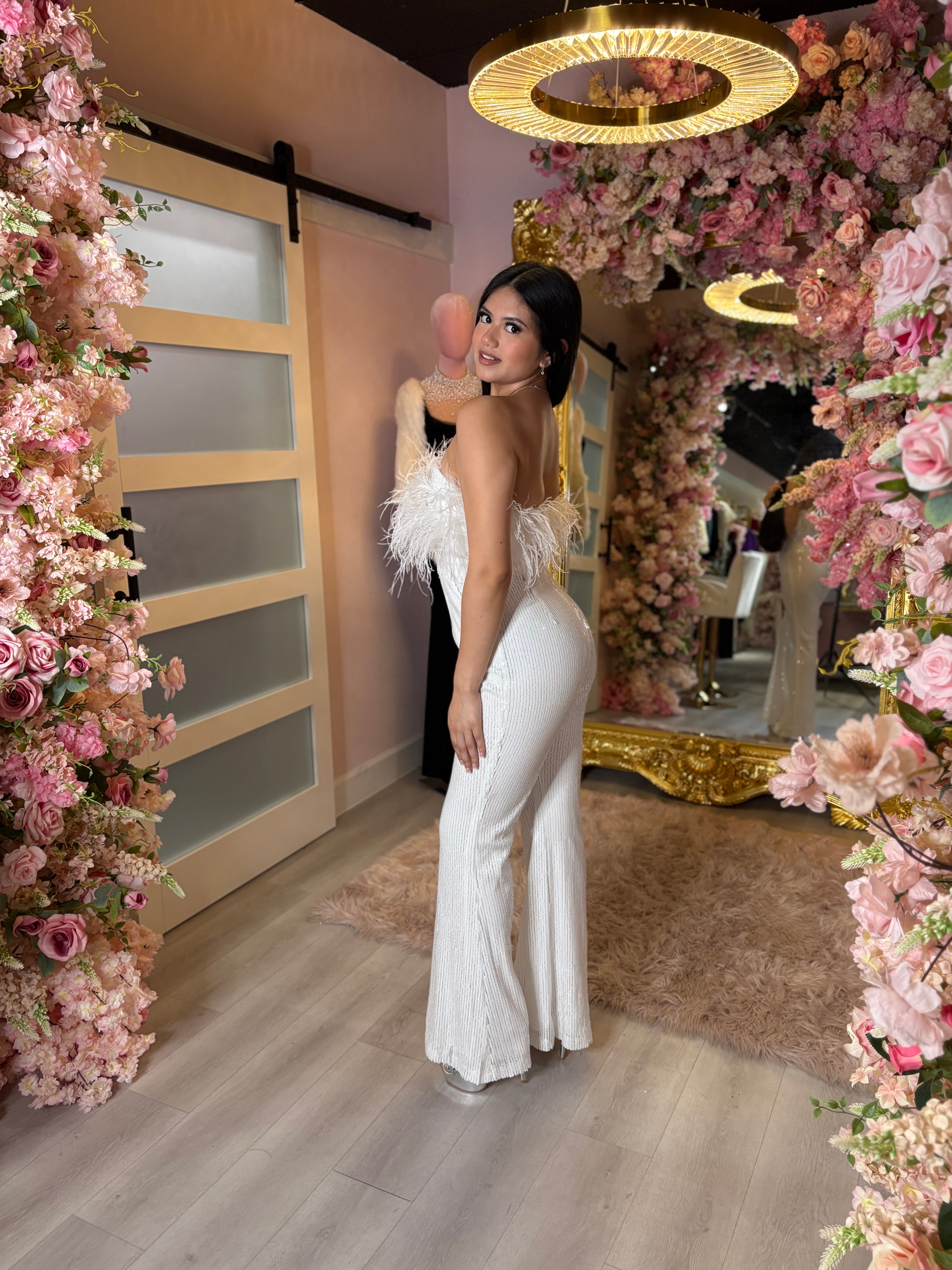The Carrie Jumpsuit is a true statement piece made to turn heads. Fully covered in shimmering sequins and finished with dramatic feather detailing at the bust, this strapless jumpsuit embodies bold femininity and elevated glamour.