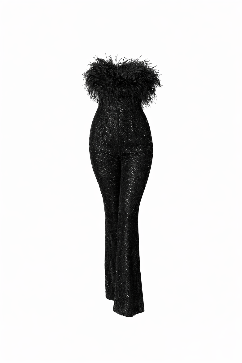 Designed with a fully structured silhouette and zero stretch, the Carrie Jumpsuit is meant to fit sleek and tailored, holding its shape beautifully. The strapless neckline is accented with soft feathers for a luxurious touch, while the flared sequin pants elongate the legs and create an elegant, striking finish.