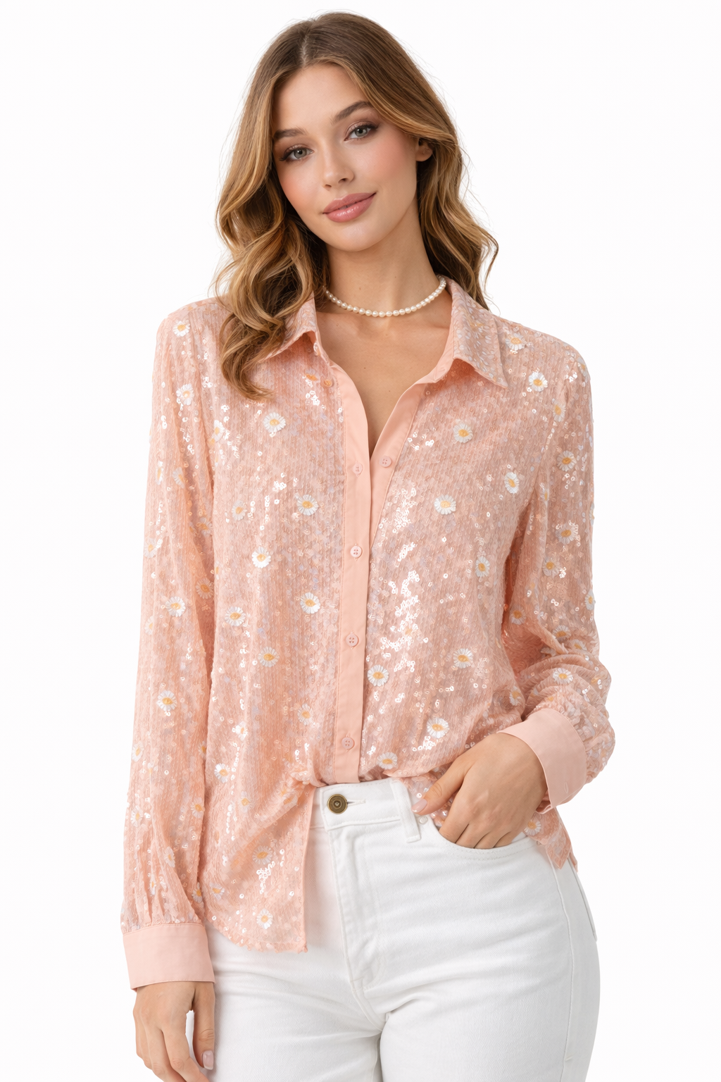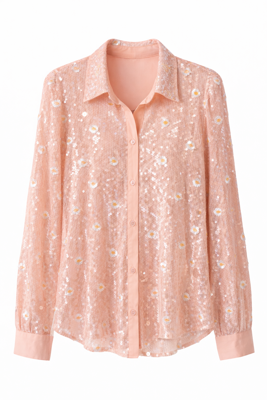 The Daisy Sequin Oversized Shirt is a statement piece that blends soft femininity with effortless elegance. Designed in a delicate blush pink tone, this shirt features transparent sequins and subtle embroidered daisy details that add a light-catching shimmer without feeling overpowering.