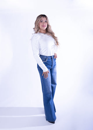 Kim White Corset Top Long Sleeves with Rhinestones Details